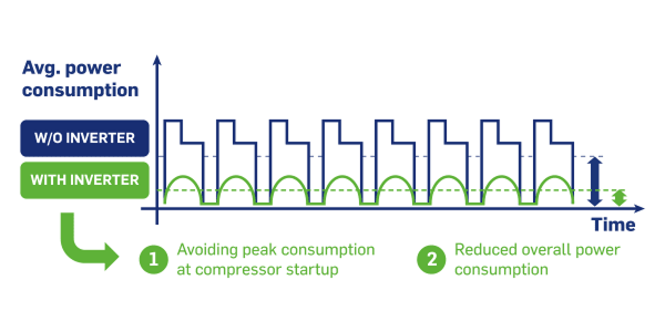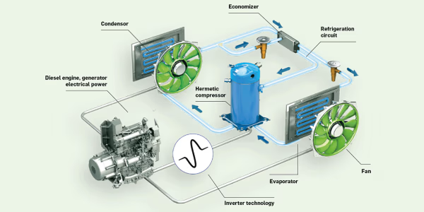 Le Vector HE 17 s’appuie sur la technologie Inverter, qui permet d'accélérer ou de ralentir la vitesse du compresseur en fonction de la charge de refroidissement. Combiné au régime réduit du moteur diesel, ce compresseur à haut rendement permet au groupe Vector HE 17 d’assurer d’excellentes performances de refroidissement, de réaliser des économies en carburant et de réduire à la fois les émissions sonores et les émissions de CO2.