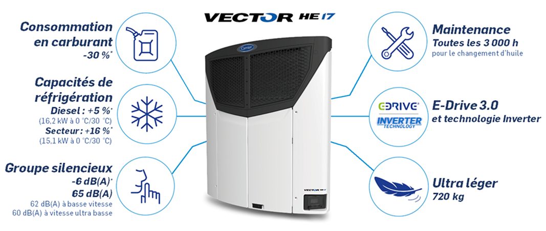 L'efficacité en mouvement, le refroidissement de semi-remorques réinventé Le groupe Vector HE 17 pour semi-remorques est le nouveau système frigorifique de Carrier Transicold, conçu pour réduire la consommation en carburant de 30 % par rapport à son prédécesseur, le Vector 1550, tout en offrant des capacités de refroidissement supérieures. Associant la technologie Inverter à l'architecture tout électrique E-Drive éprouvée, ce groupe innovant offre le meilleur coût total de possession de sa catégorie. Avec son fonctionnement silencieux, le Vector HE 17 est idéal pour les livraisons longue distance et les trajets en ville.